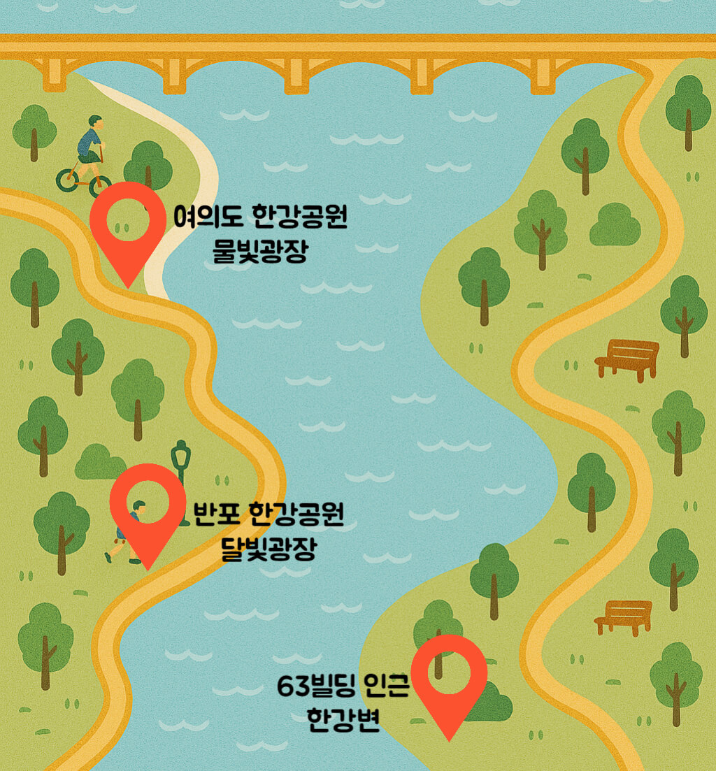 - 여의도 한강공원 물빛광장 - 드론쇼의 중심 뷰를 가장 잘 볼 수 있는 명소입니다. 음악과 조명이 함께 울려 퍼지는 중심 스피커도 여기!